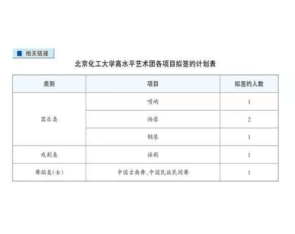 今年北京化工大学高水平艺术团招生包括器乐、戏剧和舞蹈(女)三大类别,招生计划人数为3人,拟签约6人。需要注意的是,考生提供所获资格证书上的项目,必须与报名时所选定的学校计划招录项目相一致;每名考生只能选择一个项目报名,且报名及测试过程中不能更改。