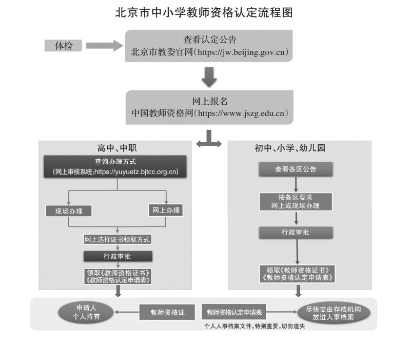 初中及以下教师资格体检要求及报名入口与高中、中职教师资格申请人相同。网上或现场办理和领取证书具体事宜可咨询各区级认定机构。