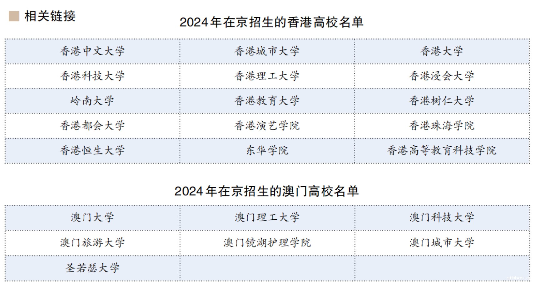 澳门特别行政区有7所高校在内地招生,分别为澳门大学、澳门理工大学、澳门旅游大学、澳门科技大学、澳门城市大学、圣若瑟大学和澳门镜湖护理学院。