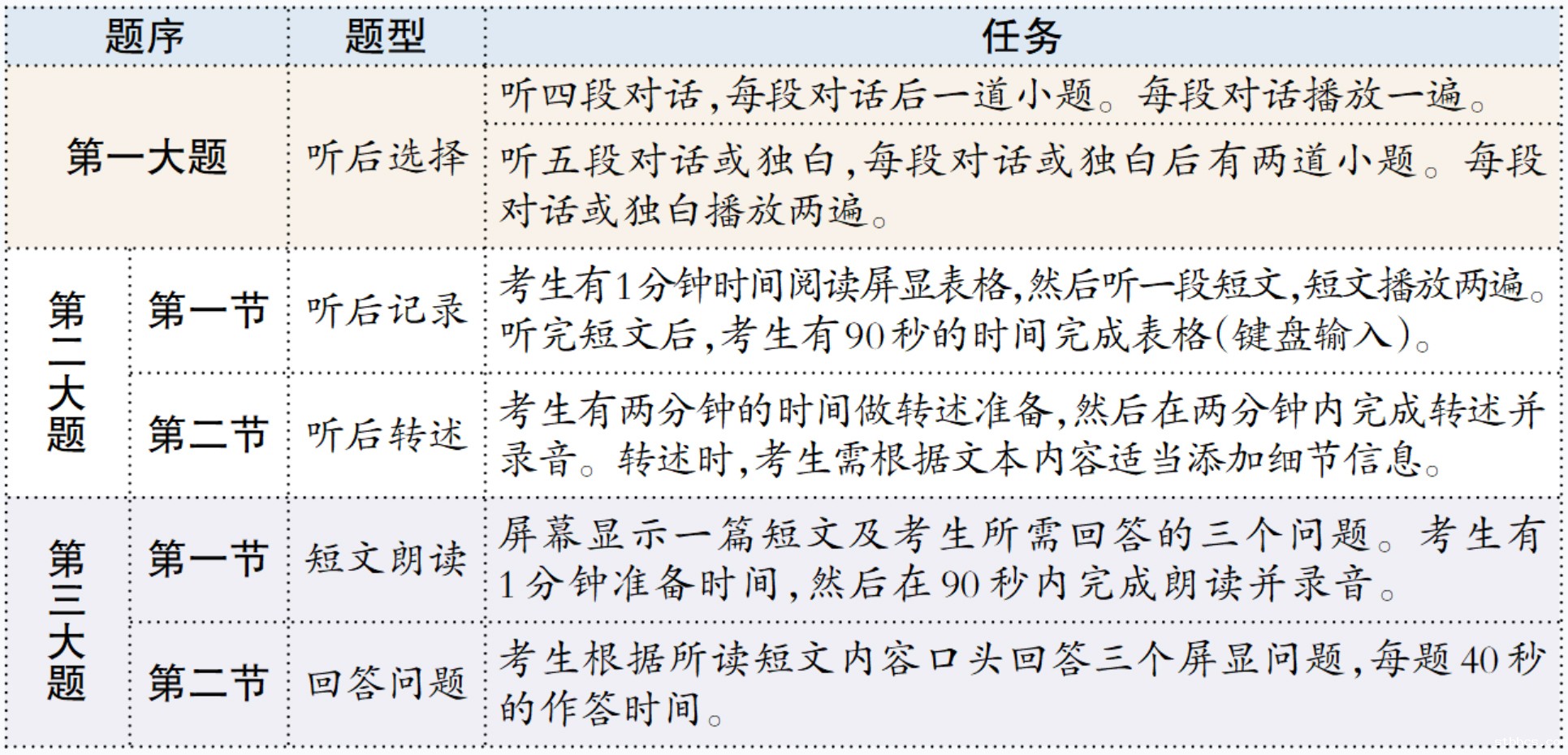 第三大题分为短文朗读和回答问题。这道大题的失分率较高,除了题目本身有难度外,还存在考生因没利用好读题时间导致的无谓失分。有的考生忙于寻找问题答案,对文章整体理解不够,在朗读中出现断句不当、磕巴等现象。