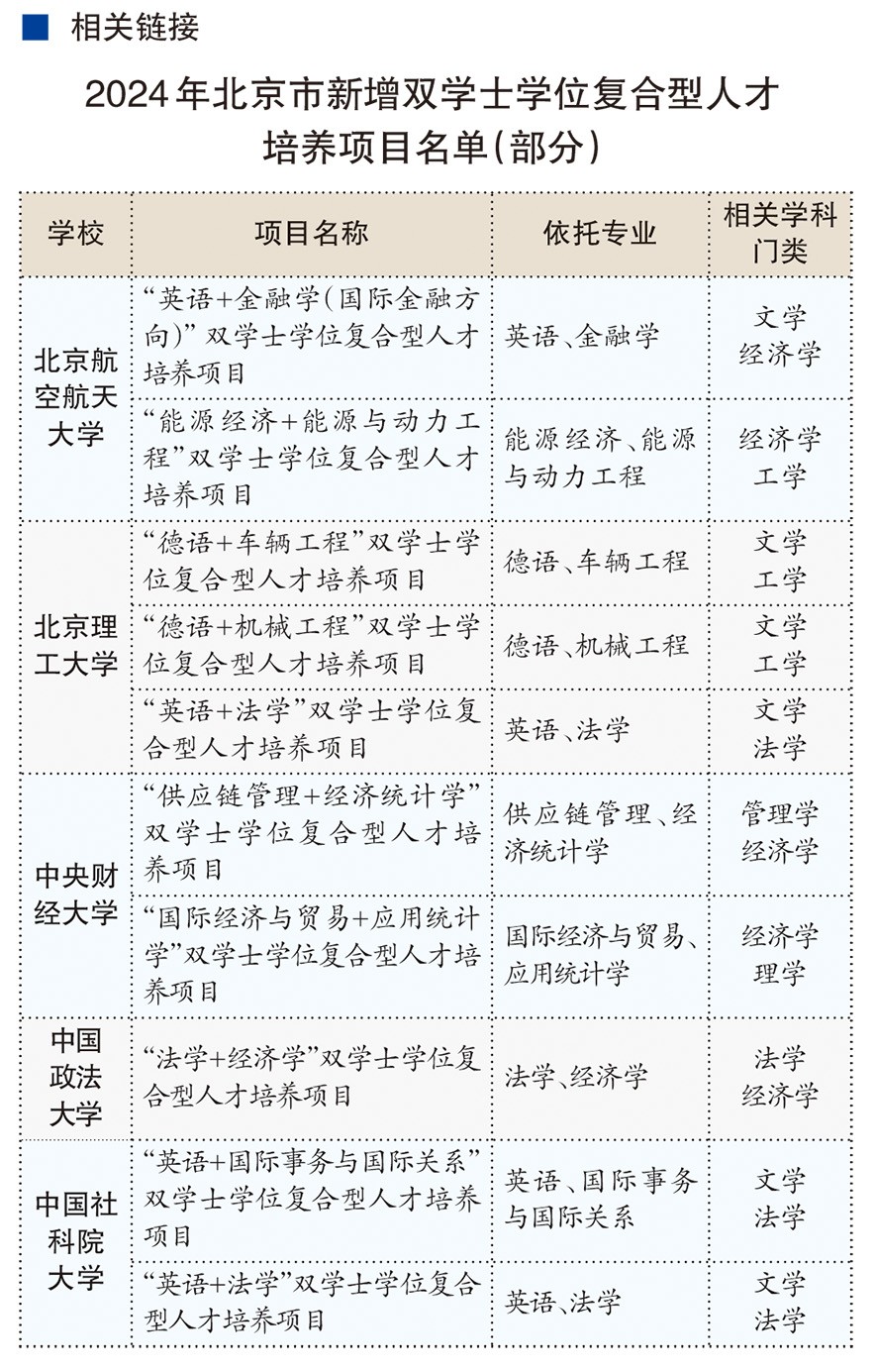 近年来,诸多高校结合本校人才培养定位、专业特色优势以及办学条件,积极开设双学士学位复合型人才培养项目。中国人民大学自2021年起开始设立双学士学位项目,目前项目总数达21个,包含“国学+古典学”“大数据技术+农林经济管理”“工商管理+法学”等。北理工围绕“人工智能+”“管理+”“数理+”“语言+”几个特色培养方向,发挥一流学科优势,已开设14个双学士学位项目。
