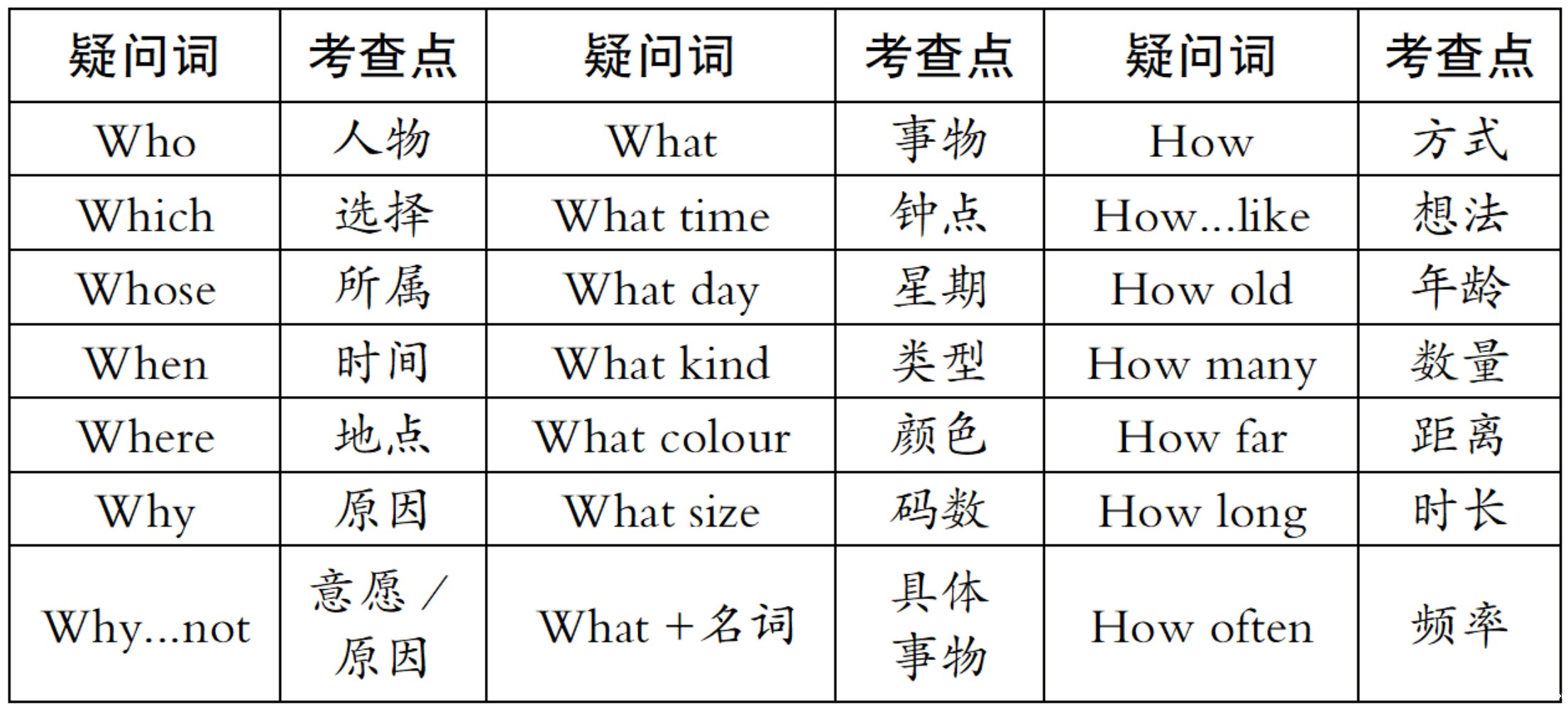 在做事实细节题时,考生需要关注疑问词考查的多样性,掌握涉及不同疑问词引导的问句,具体考查点如下表所示: