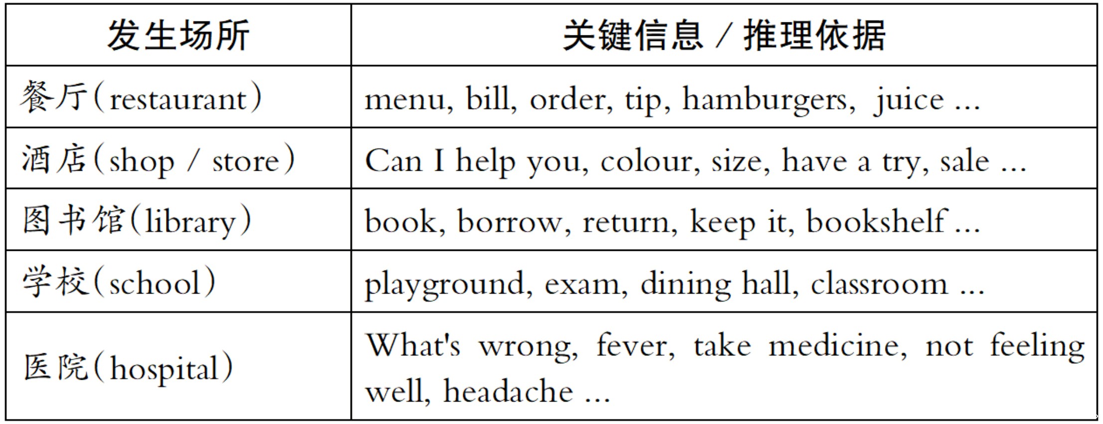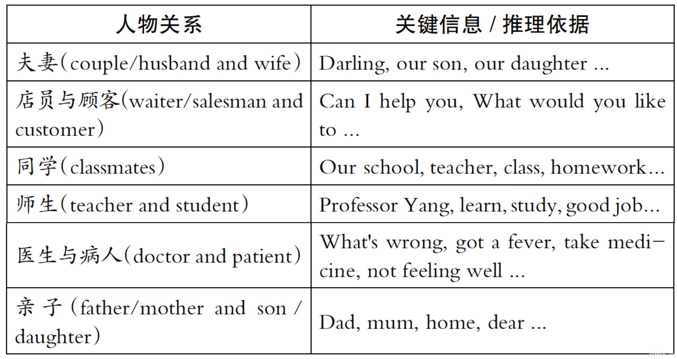 在做推理判断题时,考生需要对地点、时间、人物职业/身份、人物关系等进行简单判断。解答此类试题需要考生分析选项内容,带着题目选项内容去定位相应的关键词句,在听的过程中需要重点关注听力材料的首尾部分,并结合上下文中的关键线索信息进行判断。此外,还需要结合生活实际场景,留意并积累常见的人物关系、场所及相对应的推理依据,如以下两个表格所示: