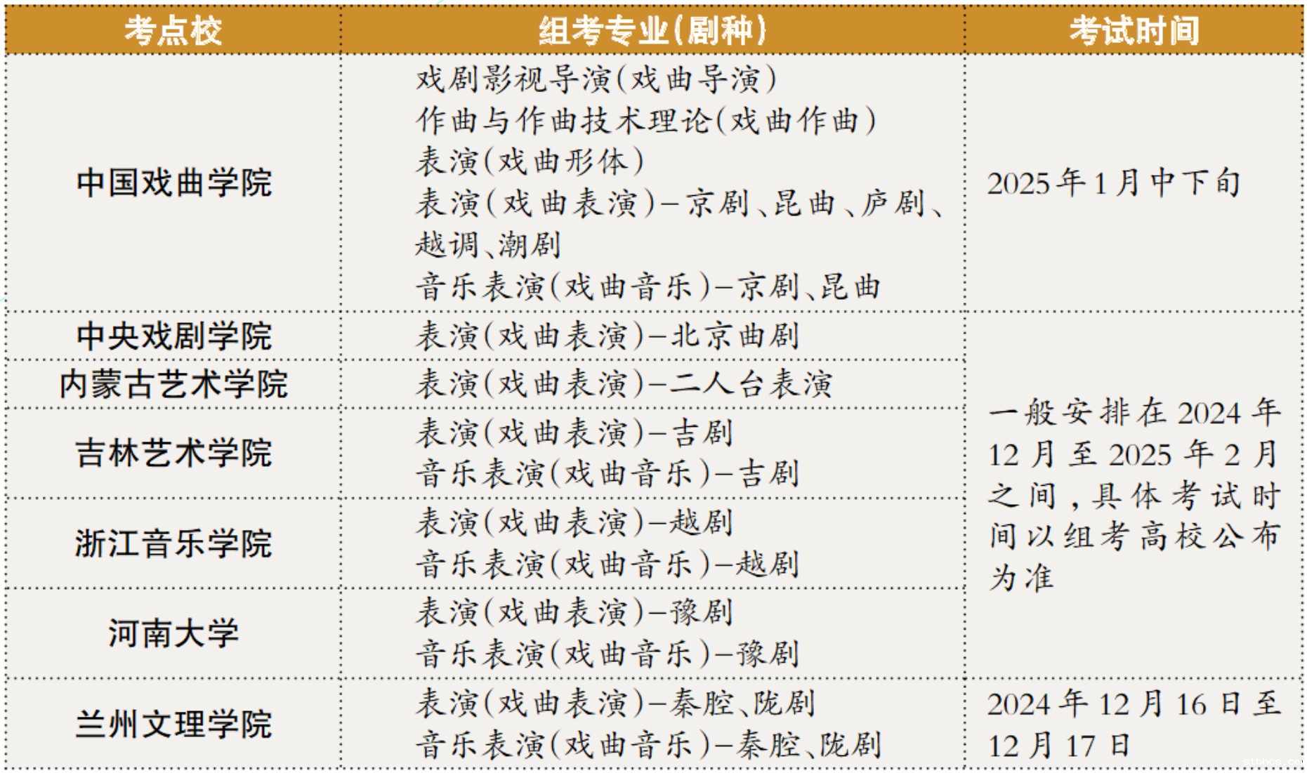 戏曲类省际联考相关专业(剧种)考试考点及考试时间