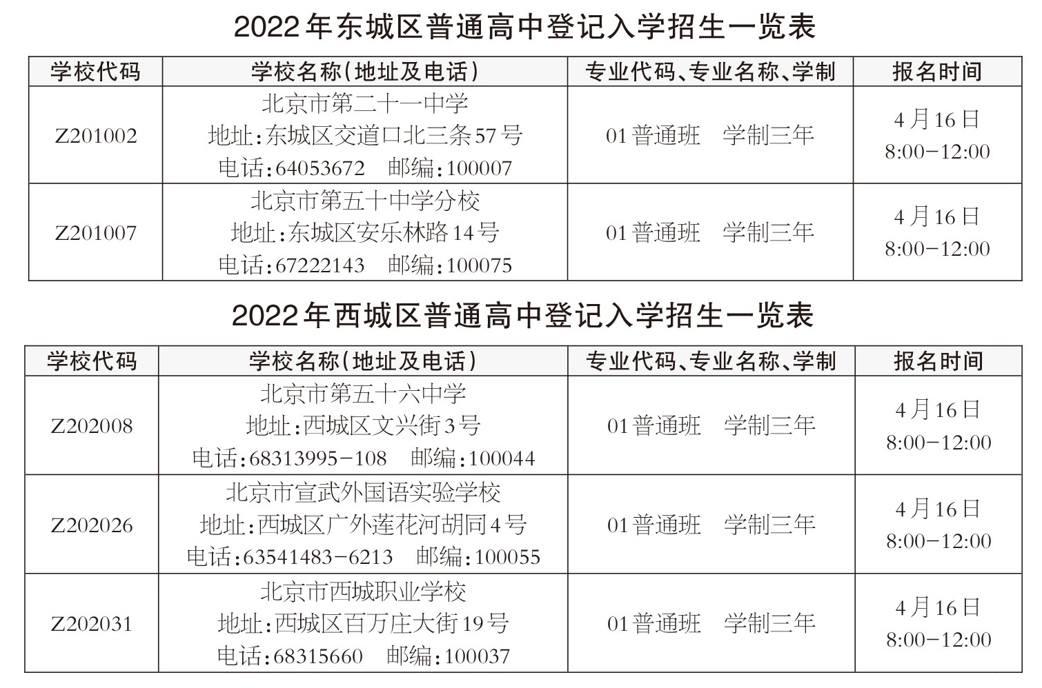 北京考试报讯(记者 安京京)记者日前从北京市教委获悉,2022年将在东城区和西城区部分普通高中开展登记入学试点,首批共有5所普通高中试点,计划招生420人。