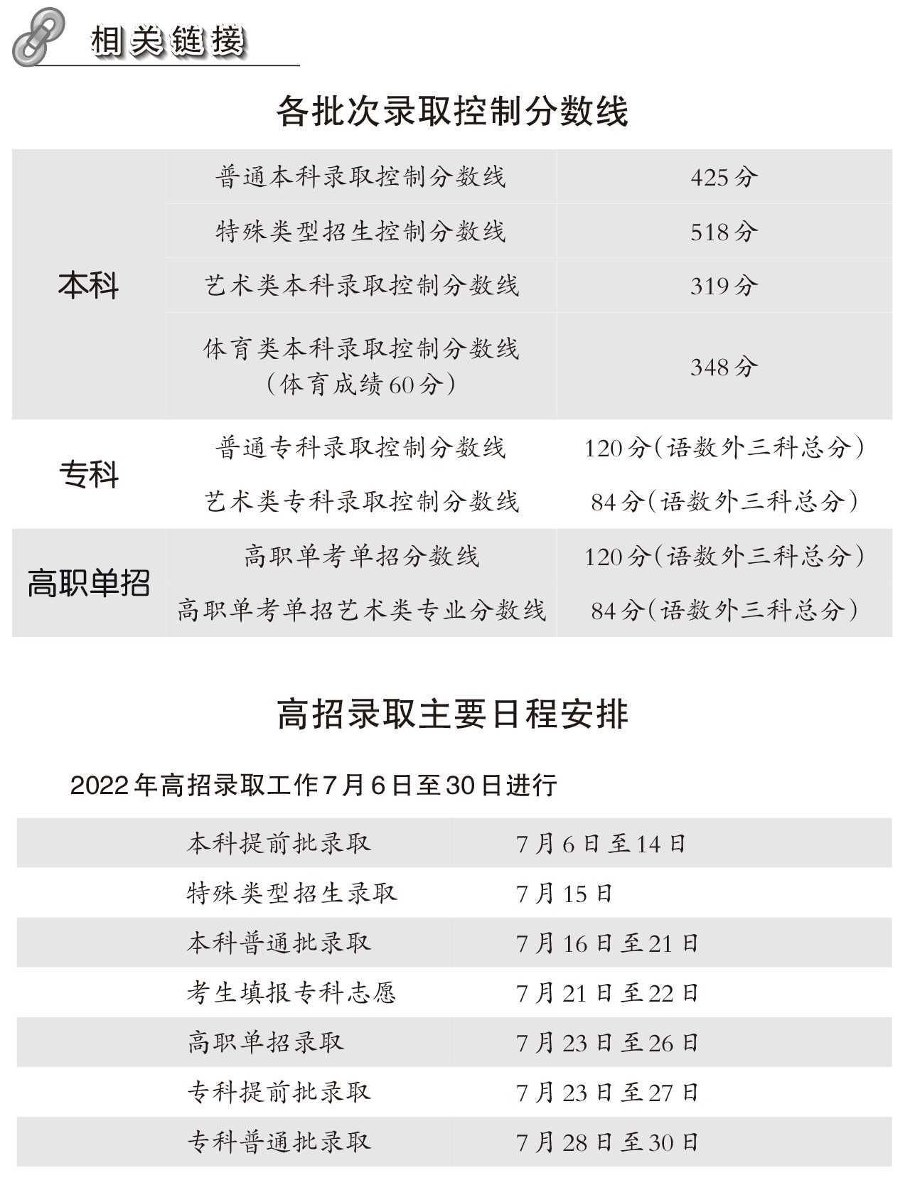 经2022年北京市招生考试委员会第二次会议审议通过,北京市上周六公布了考生高考成绩和各批次(类型)录取控制线。普通本科录取控制分数线为425分;特殊类型招生控制分数线为518分;艺术类本科录取控制分数线为319分;体育类本科录取控制分数线(体育成绩60分)为348分。高招录取工作将于7月6日至30日进行。
