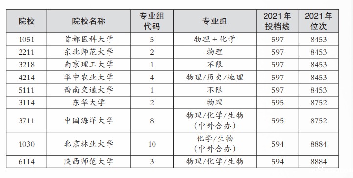 下面以2022年高考总分600分考生普通批次报考为例,谈一下“知分定位”如何操作:利用2022年一分一段人数能确定该考生在当年北京市高考排名第8671名,换算到2021年的8671名,对应分数为595—596分。参照2021年录取信息,下表中的部分高校及专业组可以作为该考生“稳一稳”的志愿选择项。
