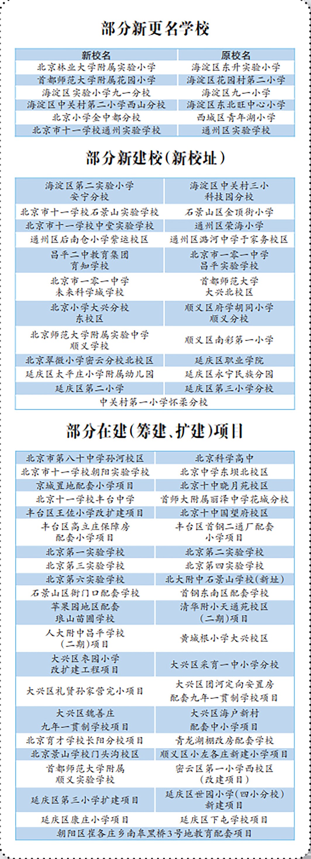 今年9月,西城区青年湖小学、海淀区东升实验小学、海淀区花园村第二小学等学校新校名正式启用,首师大附属丽泽中学南校区、首经贸附小等约20所学校即将合并、更名。海淀、丰台、西城等区通过教育布局调整,将学校更名纳入集团化管理,使原先的普通校在教学科研、教育教学、教师成长等方面均有提升。