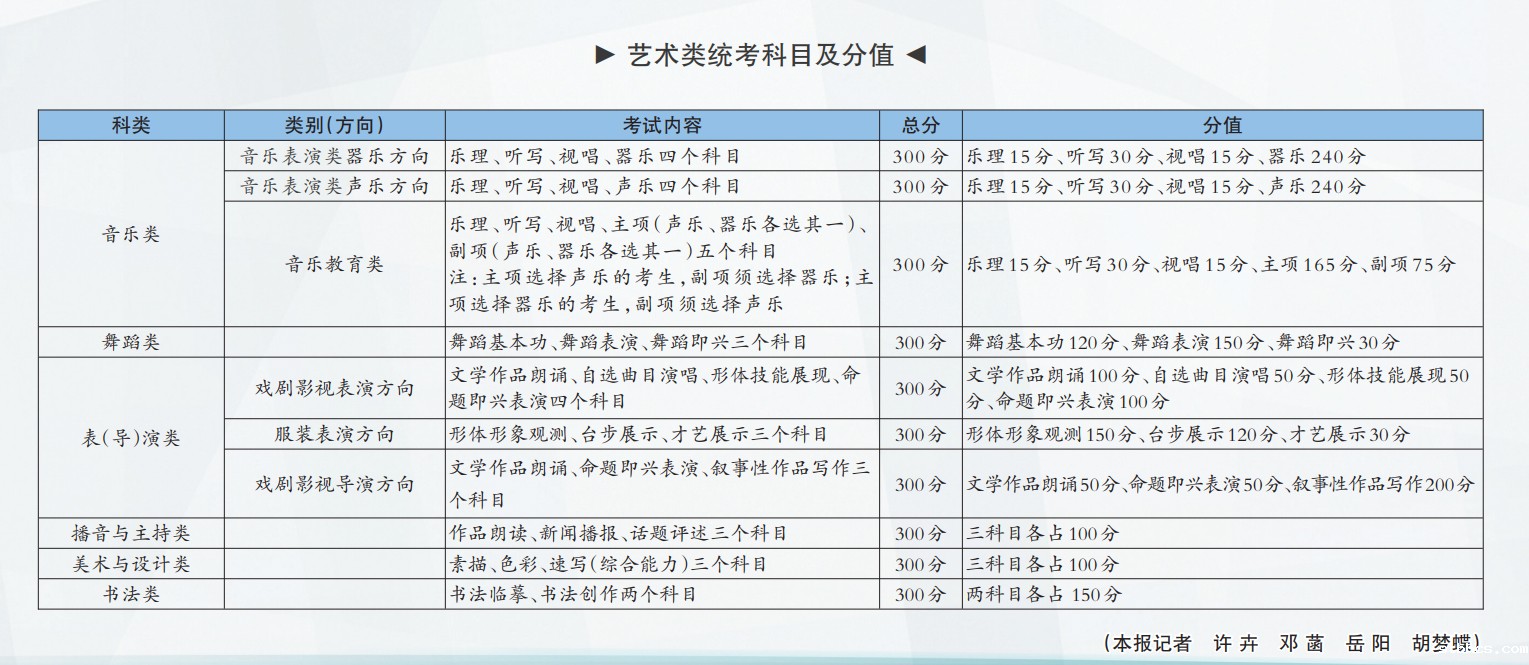 音乐类、舞蹈类、表(导)演类、播音与主持类、美术与设计类、书法类等6个艺术类专业将进行全市统考。除美术与设计类外,其余5个科类均为首次纳入统考。报考艺术类院校、专业的考生需按要求参加相应考试。