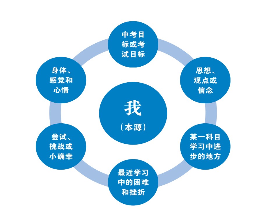 有些时候,我们把过多的注意力集中在一小部分制造恐惧的外围事物上,比如:“一模考试考得不好,我肯定去不了理想的高中。”回看“觉知之轮”,这些让我们陷入担心和焦虑的想法只是生活的一个方面,只是“觉知之轮”外围的一小部分,我们不必对这一个想法和感受投入过多关注。我们可以退一步回到本源,再去关注“觉知之轮”的其他外围内容,采用更加广阔的视角看待学习。“觉知之轮”,提供了一个整合与了解自我不同部分的工具,让我们学会对自己初三生活各个维度都有觉察,用积极态度活在当下。
