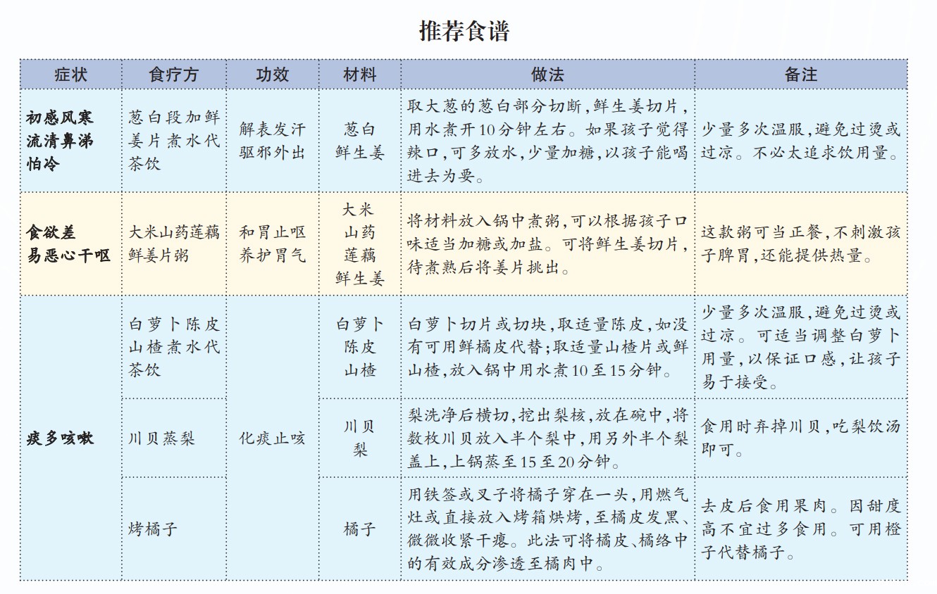 在清淡饮食、保证营养的基础上,针对不同的呼吸道疾病症状,家长不妨试试以下食疗方,尤其适用于疾病初期、恢复期的孩子。