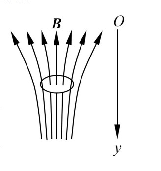 【例】 一个质量为[m]、直径为[d]、电阻为[R]的金属圆环,在范围足够大的磁场中竖直下落,磁场的分布情况如图所示。已知磁感强度竖直方向分量[By]的大小只随高度[y]变化,其随高度[y]变化关系为[By=B0(1+ky)](此处[k]为比例常数,且[k>0]),金属圆环在下落过程中环面始终保持水平,速度越来越大,最终收尾速度稳定为某一数值。求圆环收尾速率。