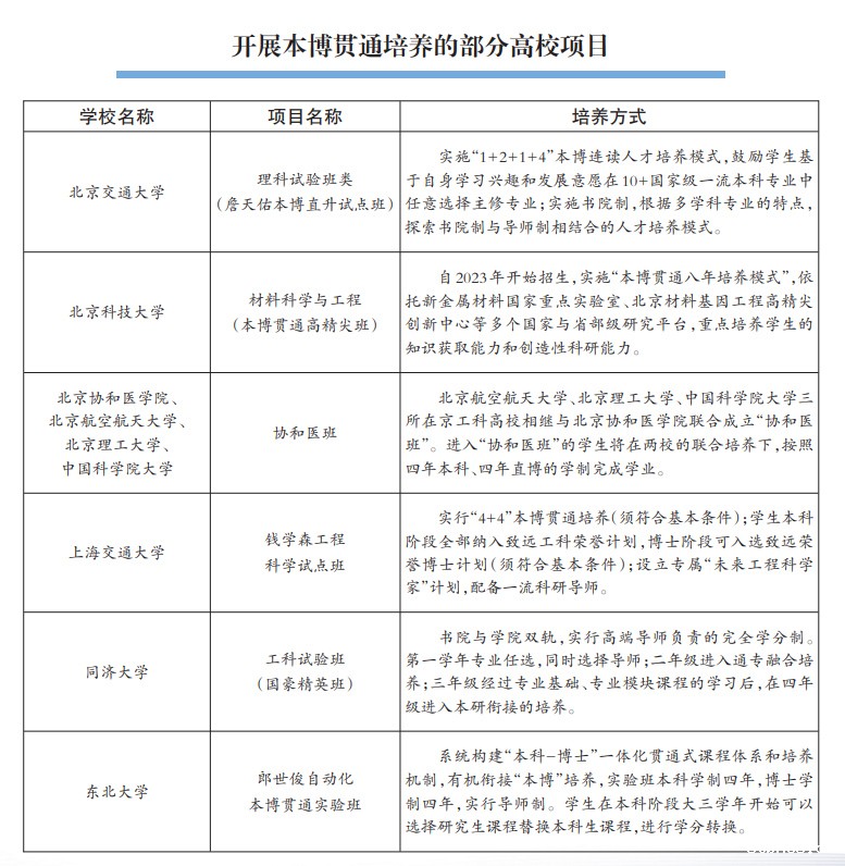 强基计划、基础学科拔尖学生培养计划、未来技术学院等均采用贯通培养模式,相关专业一般瞄准基础学科或国家战略,强化学生科研能力,培养拔尖创新人才。