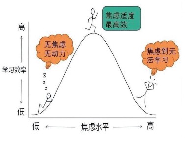 压力和焦虑情绪本身具有价值,它们可以在一定程度上帮助考生投入学习,为考试努力。然而,低于一定强度或者超出一定强烈程度的压力会对学习效率产生负面作用,正如著名的耶克斯-多德森定律曲线呈现的那样。若焦虑或者压力的水平能维持在一个适度的范围内,对学习效率是有利的。