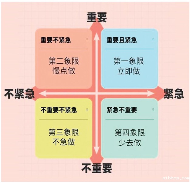 第一象限为重要且紧急的,需要立即花时间完成;第二象限是重要但不紧急的,这类任务是必须完成的,但时间上并不紧迫,可以稍微慢点做;第三象限是不重要也不紧急的,这类事情既不重要,时间上也不紧迫,所以不用着急做,如玩游戏、看电影等等;第四象限,不重要但紧急的,这些事并没有那么重要,可从时间上来看,非常紧迫这类事应少去做。
