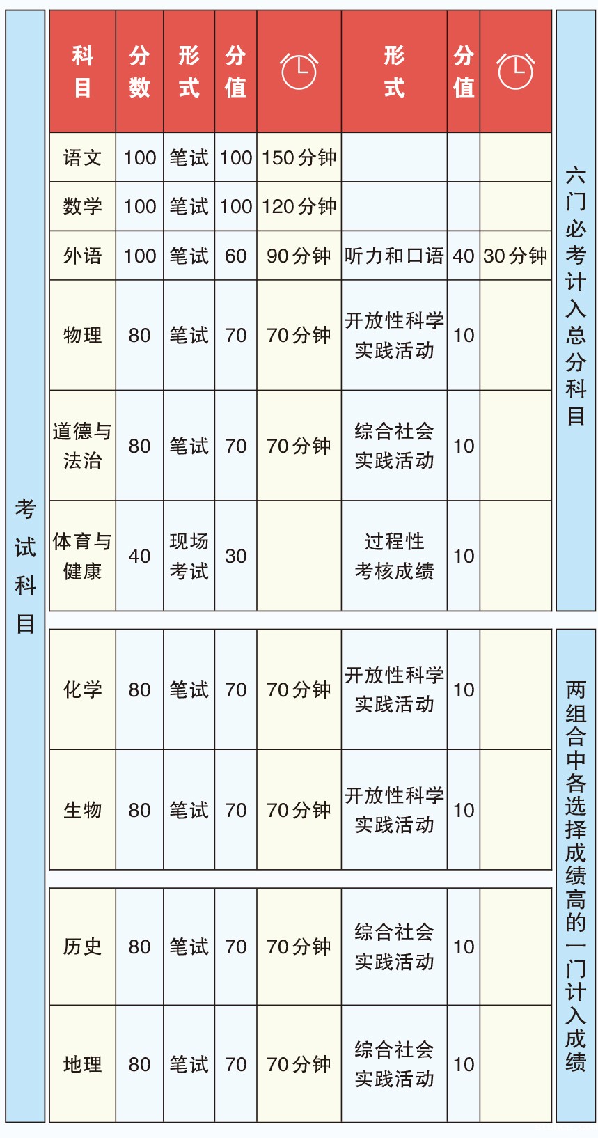 原始成绩包含以下科目:语文、数学、外语3科分值均为100分,其中外语笔试60分,听力和口语考试40分。道德与法治、历史、地理、物理、化学、生物6科分值均为80分,其中笔试70分,实践活动10分。体育与健康分值40分,其中现场考试30分,过程性考核10分。