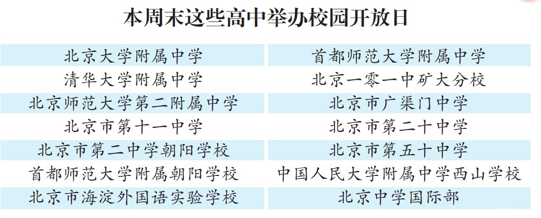北京考试报讯(记者 蔡文玲) 本周末,北京大学附属中学、首都师范大学附属中学、北京市广渠门中学、北京市第十一中学等14所学校将举办校园开放日。通过宣讲会、特色课程体验、社团展示等活动,学校全方位展示办学特色和校园文化,并为初三生和家长提供升学咨询。