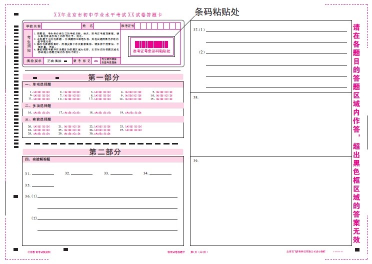 3、答题前要仔细阅读答题卡上的“考生须知”。务必用黑色字迹的签字笔将答题卡第1页左上角(数学科目还有第3页左上角)的学校名称、姓名、准考证号填写清楚,字迹不能超出框 线。考生不得自行填涂“缺考标记”栏。如下图所示: