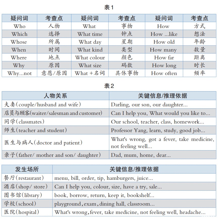 在做推理判断题时,考生需要对地点、时间、人物职业/身份、人物关系等进行简单判断,解答此类试题需要考生分析选项内容,带着题目选项内容去定位相应的关键词句;在听的过程中需要重点关注听力材料的首尾部分,综合上下文中的关键线索信息。此外,还需要结合生活实际场景,留意积累常见的人物关系、场所及相对应的推理依据。见表2。