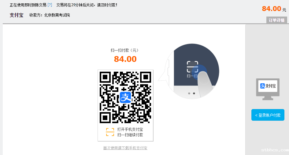 4. 如使用“支付宝”,请选择“支付宝”并点击“确认支付”,用手机“支付宝”APP扫码屏幕中二维码,或点击“登陆账户付款”按钮,登录支付宝账户进行付款。
