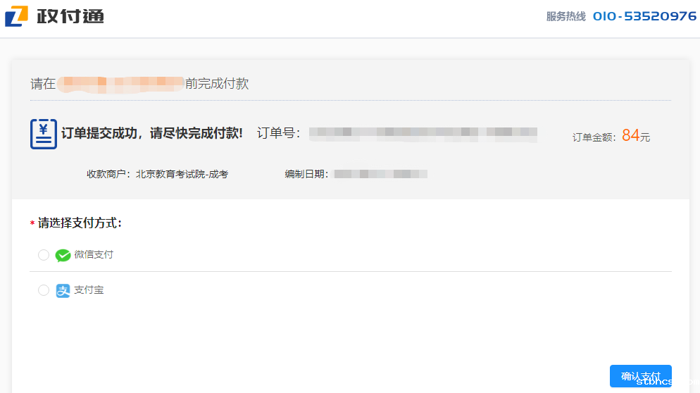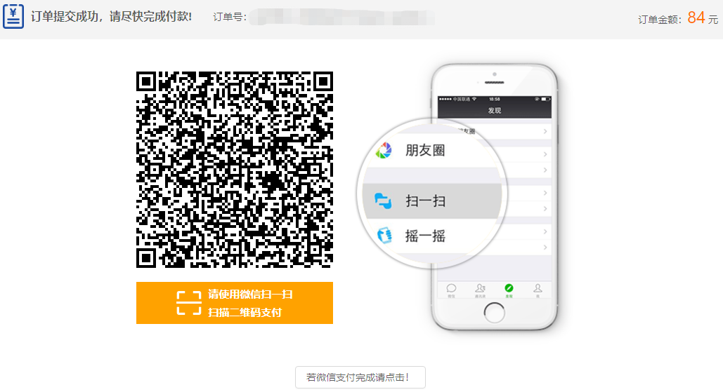 3. 如使用“微信支付”,请选择“微信支付”并点击“确认支付”,用手机“微信”APP扫码屏幕中二维码,完成付款。支付完成后请点击二维码下方“若微信支付完成请点击!”按钮。