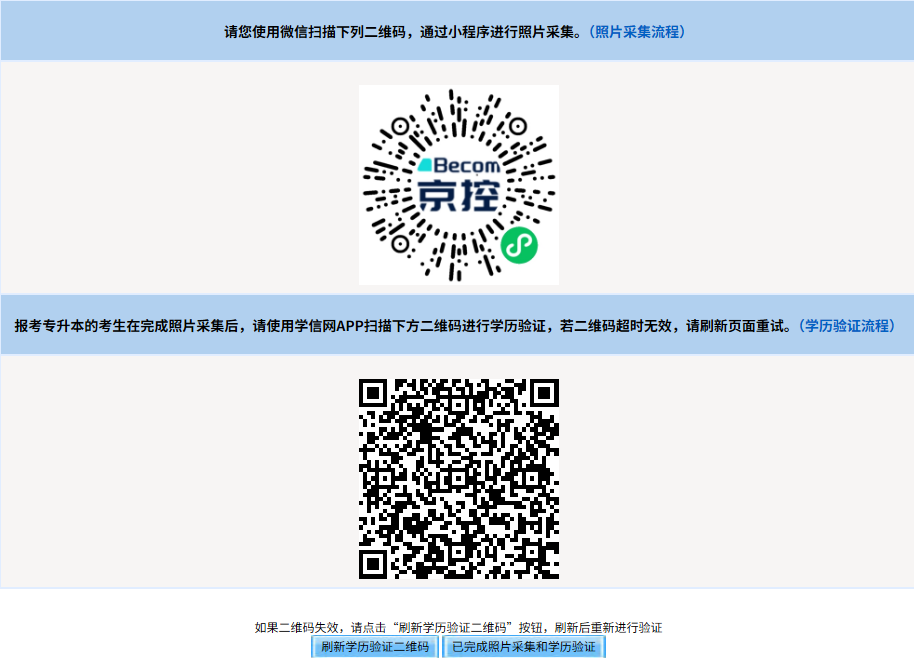 考生在完成照片采集后,学历相关信息要经教育部高等教育学生信息网(学信网)APP进行扫码授权后进行比对和审验。(点击查看验证流程)