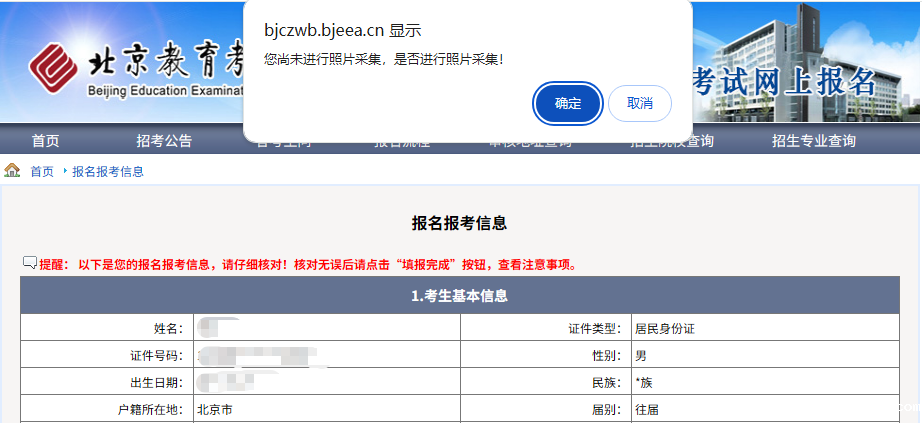 注意2:个人人像照片将用于制作准考证,注册学籍,毕业审核等用途,请在填写完基本信息及志愿信息后,按要求完成照片采集。