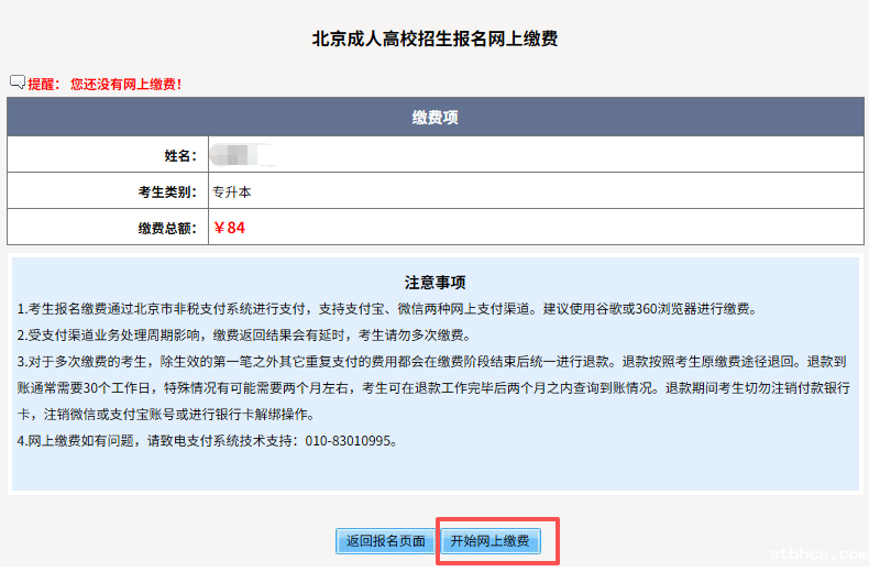 1. 审核通过的考生可以进行缴费操作。登陆报名系统后,点击最下方“确认并网上缴费”按钮,查看缴费信息及注意事项,确认后点击“开始网上缴费”。