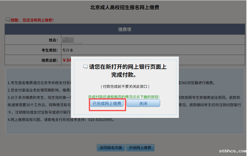 5.系统提示支付成功后,请点击“关闭窗口”并返回报名系统,点击“已完成网上缴费”按钮,查看缴费状态。如页面最下方提示“您已完成缴费,请查看报名登记表”,此时缴费成功。如缴费渠道已扣款但系统提示未改变,请30分钟后再刷新查看状态。请勿短时间内重复缴费。
