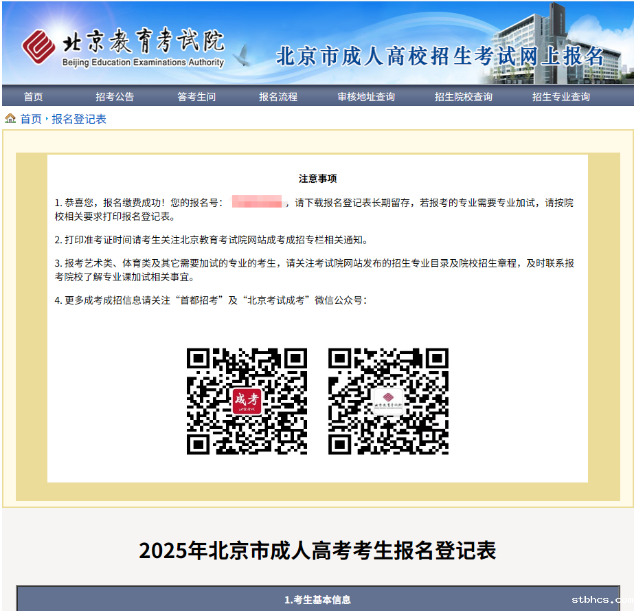 6. 请点击“报名登记表”按钮,进入报名登记表信息页面,查看注意事项,然后点击页面下方“下载报名登记表”按钮,下载《2025年北京市成人高考考生报名登记表》。登记表为PDF格式,请考生自行留存。