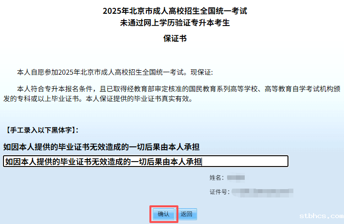 保证书填写方法:登录报名系统后,点击页面下方“填写保证书按钮”,进入保证书填写页面,请手工录入页面所提示的文字,录入完成后点击“确认”按钮,完成录入。