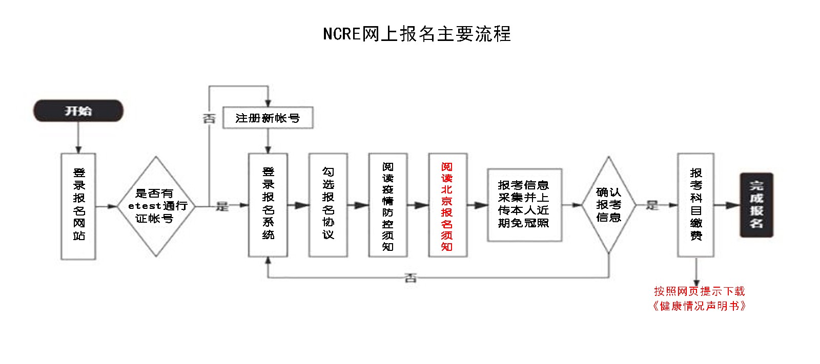 NCRE采取网上报名,报名考务费每科目75元。选择在北京市所属考点进行考试的考生,应登录全国计算机等级考试报名网站(网址:https://ncre-bm.neea.cn),点击“(11)北京市”报名入口进行网上报名,考生登录报名网站后,须认真阅读“省通告:北京市NCRE报名须知”,知悉并遵照报考及疫情防控相关事项要求,按照相关提示完成信息填写、照片上传、缴费等程序。考生若已有账号,可直接登录报名;若没有账号,需登录ETEST通行证网站进行注册。