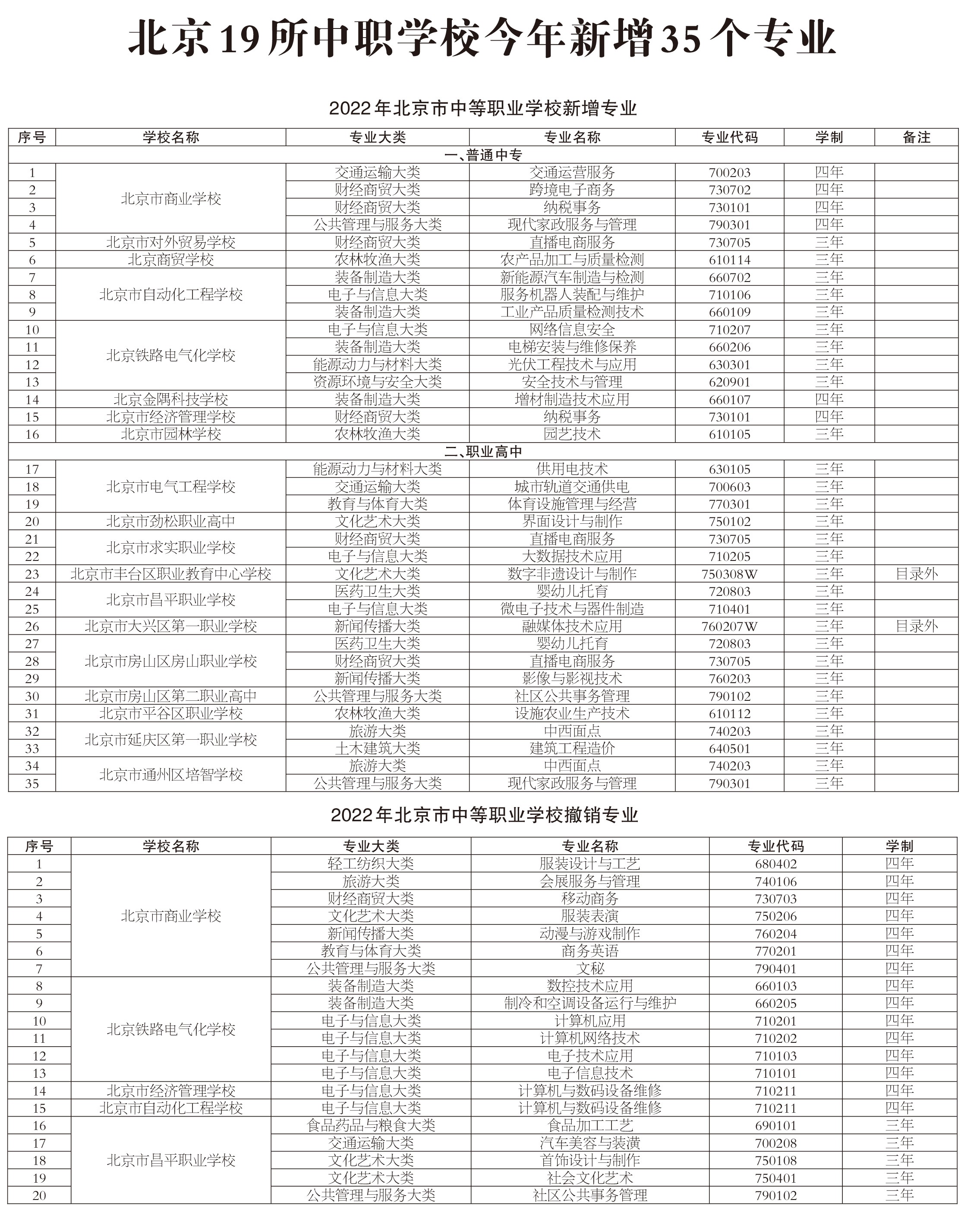 按照《教育部办公厅关于印发〈中等职业学校专业设置管理办法(试行)〉的通知》和《教育部职成司关于做好2022年职业教育拟招生专业设置管理工作的通知》要求,市教委组织专家对2022年申报新增的中职专业综合评议,确定对19所学校的共35个新增专业予以备案,撤销5所学校共20个专业。