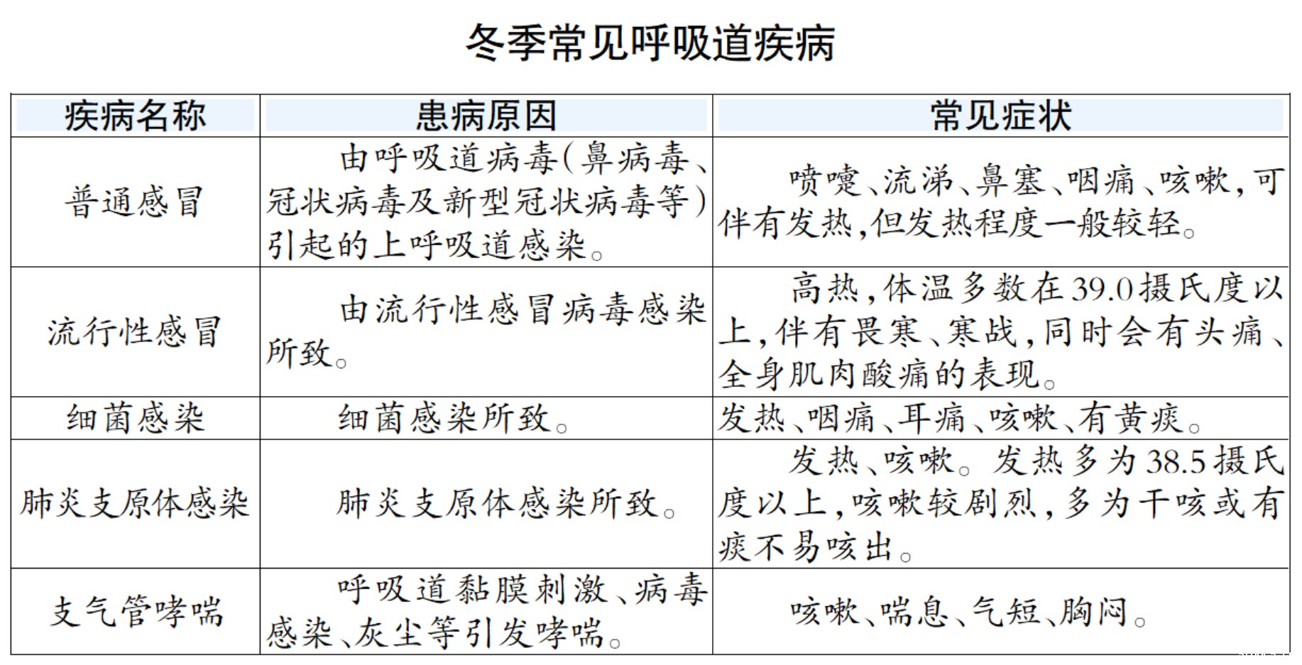 初中生冬季常见的呼吸道疾病包括普通感冒、流行性感冒、化脓性扁桃体炎、肺炎支原体感染所致的支气管炎和肺炎等感染性疾病以及慢性呼吸道疾病支气管哮喘急性发作等。