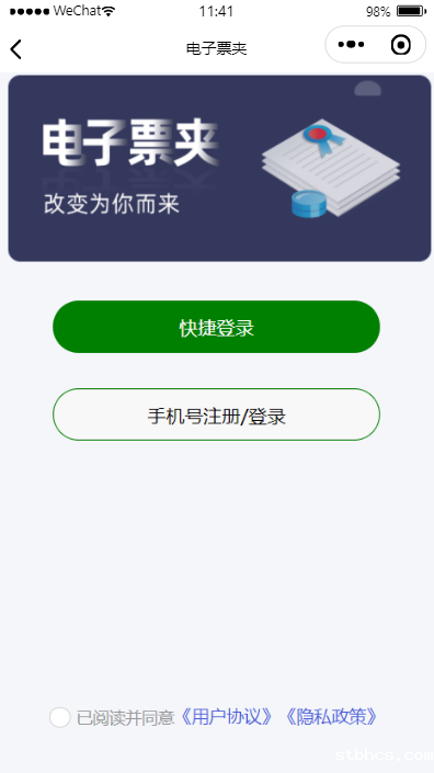 首次进入电子票夹小程序时会进入登录页。首次注册时需查看用户注册协议,隐私政策协议,点击【用户注册协议】【隐私政策】查看协议内容,点击勾选即表示同意协议内容。