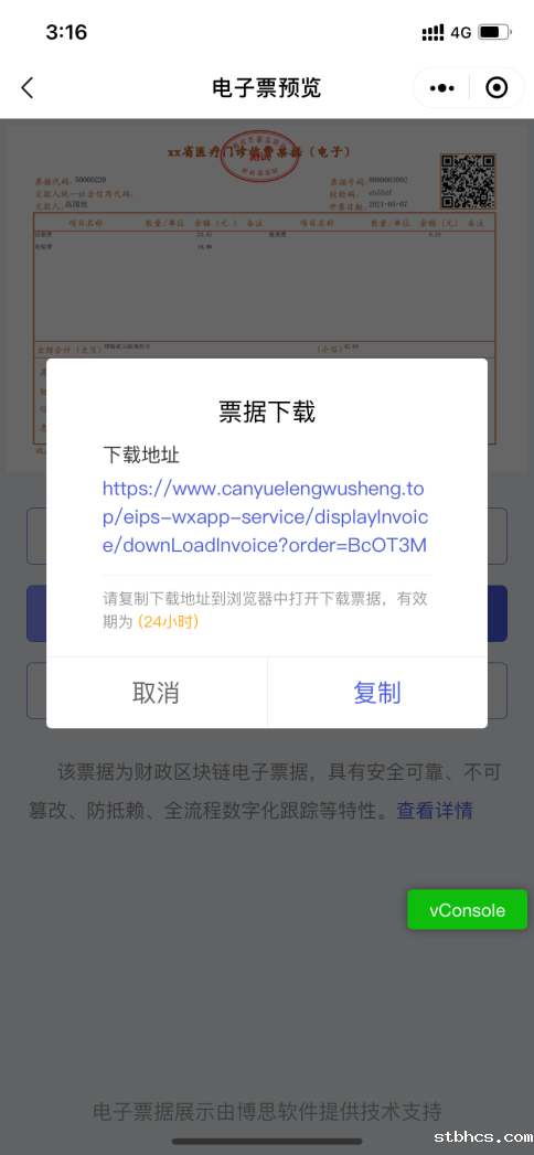 票据详情页点击【查看电子票】,展示电子票据图片并显示【票据下载】、【发送至邮箱】按钮。点击票据放大显示票据图片。